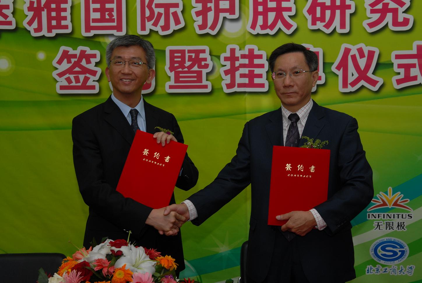 會上謝志華副校長親切致辭,并與楊國晉高級副總裁簽訂了合作合同。楊國晉副總裁為何聰芬教授、董銀卯教授頒發了“萃雅國際護膚研究中心”主任和首席研究員聘書。