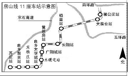房山線沿線共設車站11座:蘇莊、良鄉(xiāng)南關(guān)、東楊莊、良鄉(xiāng)大學城、水碾屯、廣陽城、籬笆房、長陽、稻田、大葆臺、郭公莊