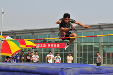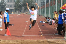 助跑!彎腿!蓄力!起跳!前沖!在男子跳遠預決賽現場,參賽隊員的激情和活力展示著工商學子積極向上的風采。只見一個身著迷彩短袖的男生以百米沖刺的速度助跑,起跳線前騰空一躍,連胳膊上纏繞著的紫色絲帶都跟著跳動起來。騰空的身影,青春的迷彩,紫色的絲帶,連腳下金黃的沙坑都跟著躍動起來。