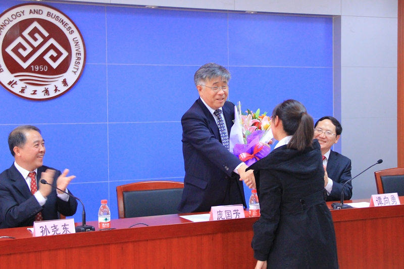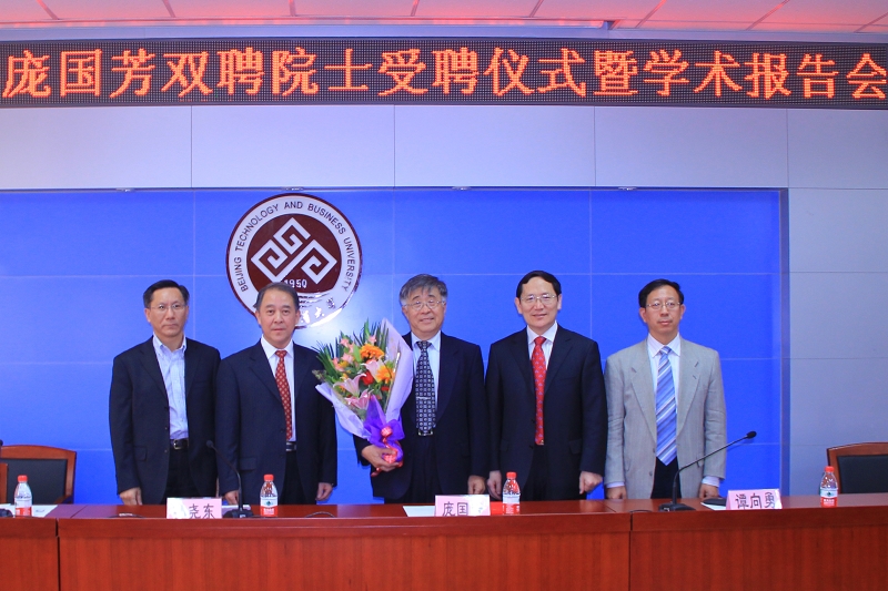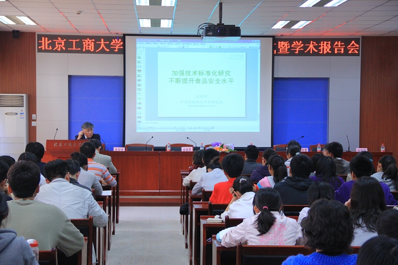 龐國(guó)芳院士表示,他對(duì)北京工商大學(xué)懷有很深的感情,他將盡力做好這份工作,希望今后能和化學(xué)與環(huán)境工程學(xué)院的廣大師生一起共同努力為學(xué)校、為國(guó)家做出更大貢獻(xiàn)。受聘儀式后龐國(guó)芳院士為與會(huì)師生作了題為“加強(qiáng)技術(shù)標(biāo)準(zhǔn)化研究不斷提升食品安全水平”的學(xué)術(shù)報(bào)告,就現(xiàn)階段我國(guó)與世界先進(jìn)國(guó)家食品安全標(biāo)準(zhǔn)的差距、20年來(lái)我國(guó)食品技術(shù)標(biāo)準(zhǔn)研究的創(chuàng)新及取得的業(yè)績(jī)、如何破解先進(jìn)國(guó)家技術(shù)堡壘、構(gòu)建我國(guó)技術(shù)標(biāo)準(zhǔn)體系、技術(shù)創(chuàng)新與實(shí)現(xiàn)可持續(xù)發(fā)展等方面做了精辟的分析和講解,對(duì)青年科技工作者提出了殷切希望。他的精彩報(bào)告吸引了在場(chǎng)的每一個(gè)人,報(bào)告會(huì)在全場(chǎng)師生熱烈的掌聲中結(jié)束。