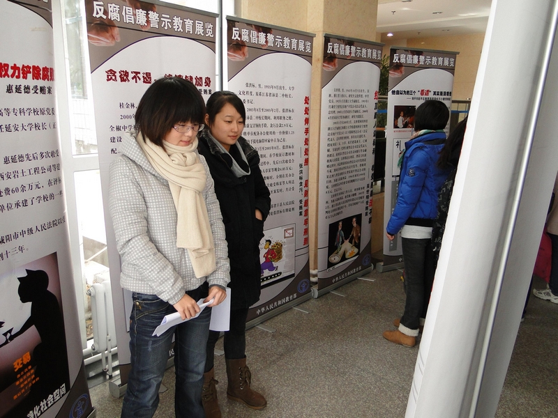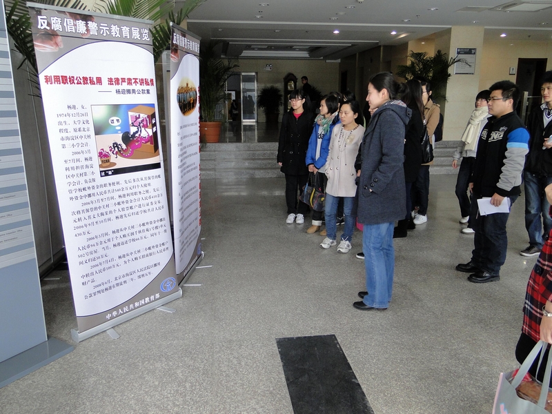 11月11日中午,在阜成路西區(qū)綜合樓一層大廳,研究生部團總支組織研究生主要學生干部30人參觀了反腐倡廉警示教育圖片展覽。此次活動是研究生廉潔教育宣傳周活動中的一項重要內(nèi)容。