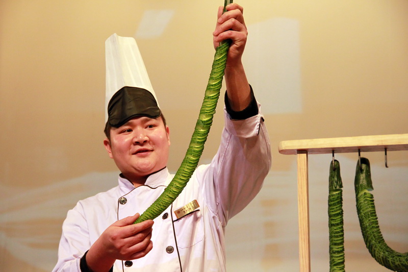 在《勞動(dòng)者的風(fēng)采》這個(gè)節(jié)目中,大廚的刀工給同學(xué)們留下了深刻的印象,幾個(gè)癡迷的觀眾竟追著大廚到了后臺(tái),圍著大廚剛切出的“蓑衣黃瓜”不停地拍照,最后“蓑衣黃瓜”難逃被搶吃一空的命運(yùn),師傅看著這情景只能哭笑不得。