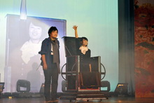“咳咳,嗆死我了。”后臺(tái)工作人員被濃重的舞臺(tái)干冰煙霧嗆得直咳嗽。為了達(dá)到更好的舞臺(tái)效果,在彩排后,主辦方特意加重了舞臺(tái)煙霧的濃度,這就使得這些后臺(tái)工作人員有幸“大飽口福”。