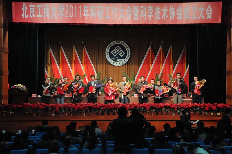 1月12日下午,阜成路校區禮堂內鮮花簇擁,喜氣洋洋,北京工商大學2011年科研工作暨科學技術協會成立大會在此隆重召開。北京市科協黨組書記、常務副主席夏強、副主席周立軍,校黨委書記孫堯東、校長譚向勇、黨委副書記盧思鋒、副校長孫寶國、謝志華、李朝鮮、張耘、呼文亮,全體中層干部、??茀f全體委員、教工代表、獲獎單位代表和個人、學生代表參加了會議。會議由黨委副書記、紀委書記張德玉主持。