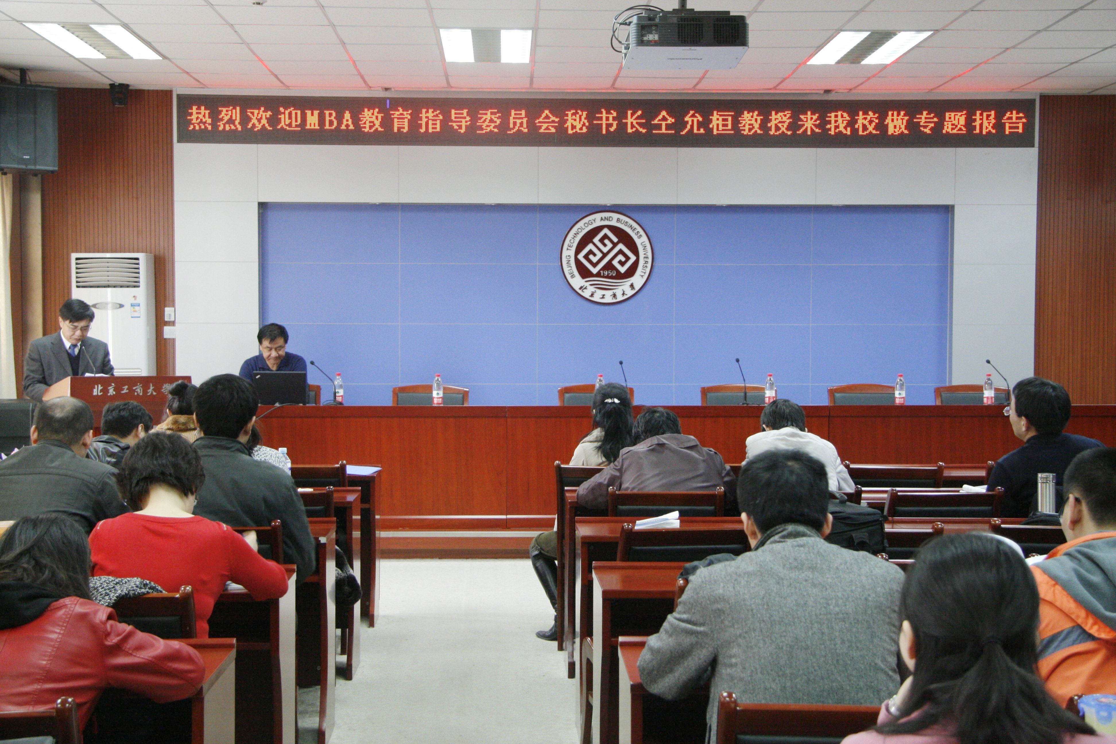 319下午,應我校MBA教育中心邀請,MBA教育專家、全國MBA教育指導委員會秘書長仝允桓教授及全國MBA教育指導委員會秘書處辦公室主任王萍老師來我校考察指導工作。仝允桓教授給我校MBA學生做了“如何寫好MBA學位論文”的專題報告,隨后與有關部門領導、MBA任課教師及MBA教育中心工作人員舉行了座談會。座談會后,譚向勇校長親自接見了兩位專家,并對專家的考察指導表示歡迎。