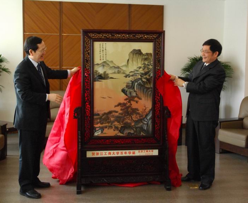 2011年適逢浙江工商大學(xué)建校100周年,譚校長代表北京工商大學(xué)全校師生員工向浙江工商大學(xué)百年校慶捐贈屏風(fēng)一樽,并預(yù)祝百年校慶各項(xiàng)活動圓滿成功。佇立錢塘江畔,耳邊潮水湯湯,兩校領(lǐng)導(dǎo)同勉要繼承兄弟高校情誼,在實(shí)施科教興國和人才強(qiáng)國戰(zhàn)略中,勇立改革創(chuàng)新、特色名校、加快轉(zhuǎn)型、科學(xué)發(fā)展的歷史潮頭。