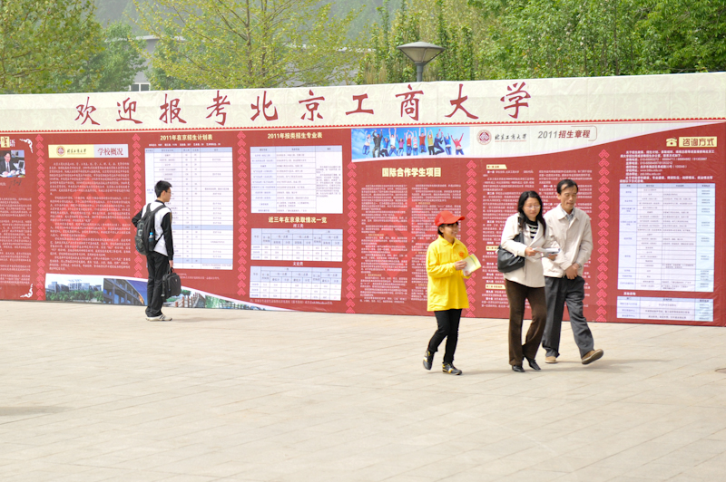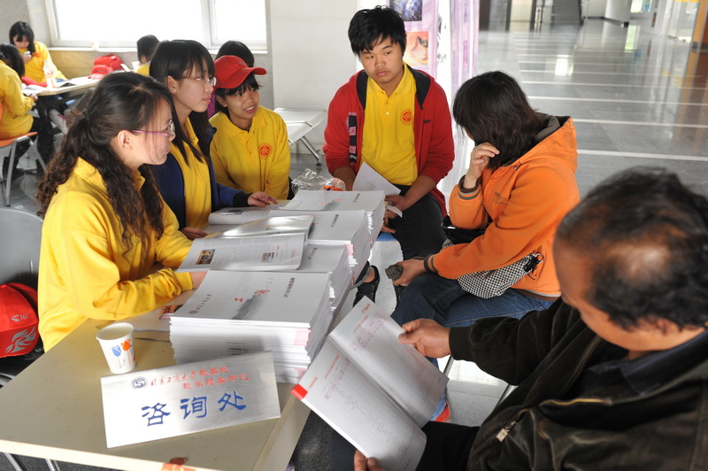 8點(diǎn),印有“歡迎報(bào)考北京工商大學(xué)”標(biāo)語的大型展板,早已樹立在校門前;學(xué)生活動(dòng)中心內(nèi)的咨詢臺(tái)上擺滿了詳細(xì)的宣傳資料;30名學(xué)生志愿者早早到位,為一天的工作做充分準(zhǔn)備。