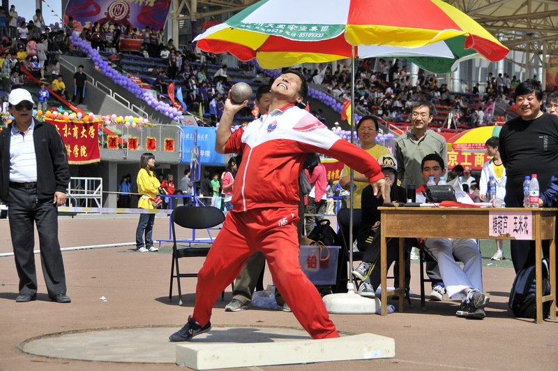 比賽開始了,只見他平穩的托著重達7公斤的鉛球,專注地鎖定著遠方的目標并積著全身的力量。他緩緩地將鉛球夾在頭與肩之間,深呼吸。接著一個漂亮的轉身,迅速有力地將鉛球推送出去,鉛球劃過一道完美的弧線,動作毫無拖沓。很難想象,一位50多歲的老人仍有如此的力量與活力。