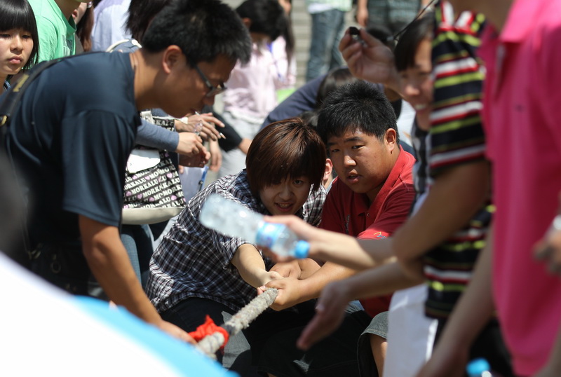 力量與智慧的比拼,激情與實力的抗衡。簇擁的人群中,不時爆發出的陣陣歡呼聲,這就是拔河比賽的現場。拔河比賽,寸土必爭,繩中間那象征著勝利標志的紅綢面臨著艱難的抉擇,一次又一次地左右猶豫,始終拿不定“主意”,嘉華學院憑借著強大的力量最終爭取到了紅綢,也贏得了最后的冠軍。汗的交織,血的沸騰,點燃著所有人的激情。長繩比賽中,穿梭的隊員像水中的蛟龍,在翻騰的“海水”中盡情遨游,會計101的同學們以3分鐘340個的優秀戰績成為了當之無愧的“龍王”。單人跳繩中,飛快旋轉的短繩忽隱忽現,跳動的運動員身姿輕盈,最終,工商108班張昊和工商105班曹雅丹分別獲得了男女子組冠軍。