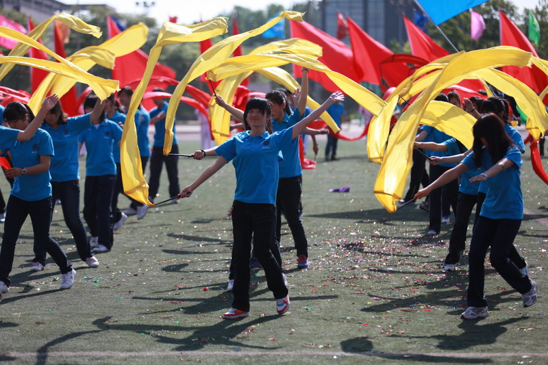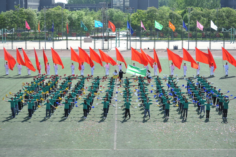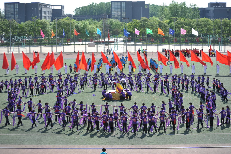 理學(xué)院的男女生們穿著藍(lán)色的衣服,分別手持紅色、黃色綢帶,在操場中央動感起舞。作為一個新成立的學(xué)院,他們擺出了“合”字陣型,這體現(xiàn)了全體師生齊心合力,團(tuán)結(jié)奮進(jìn)的堅定信念。