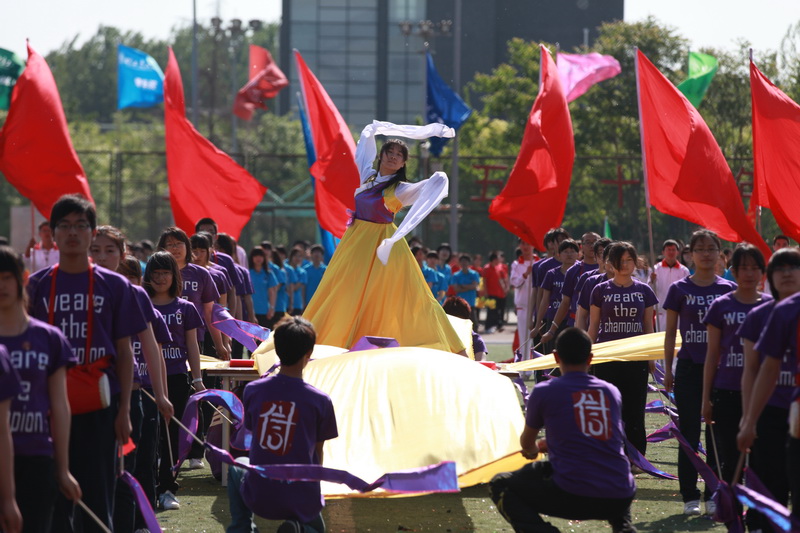 伴隨著動感的音樂,食品學(xué)院的學(xué)生身著綠色上衣沖進(jìn)了操場。他們把隊伍分為五個方陣,分別手持紅、黃、藍(lán)、銀色亮碎兒跳起了活力十足的啦啦操。一時間操場上春意盎然,青春的氣息撲面而來。