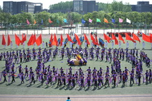 作為衛(wèi)冕冠軍,計信學(xué)院這次志在三連霸。在表演的一開始,看臺上就喊出了“計信健兒勇奪魁”的口號,紅色的腰鼓,紫色的方陣,《黃種人》震撼的伴奏音樂……計信學(xué)院這次真是霸氣外露,王者氣息十足。