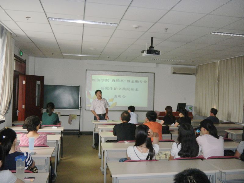 6月30日, 經濟學院“犇騰杯”暨金融專業研究生論文獎勵基金表彰會在阜成路校區舉行,學院領導楊德勇、李寶仁、李書友、馬若微與09級、10級的研究生代表參加了表彰會,會議由金融系主任栗書茵主持。