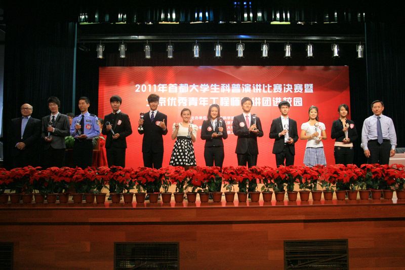 9月24日上午,2011年首都大學生科普演講比賽決賽暨北京優秀青年工程師進校園活動在北京工商大學隆重舉行。活動由北京市科學技術協會、共青團北京市委員會共同主辦,北京工商大學科學技術協會與共青團北京工商大學委員會承辦。中國科協發展研究中心主任調研宣傳部副部長王康友,北京市科協科普部副部長姚儀鸞,共青團北京市委員會大學部副部長張賀鋒,北京科技咨詢中心副主任何素興,中國工程院院士、北京工商大學副校長孫寶國,北京工商大學副校長謝志華、李朝鮮、方德英出席了本次演講比賽。