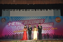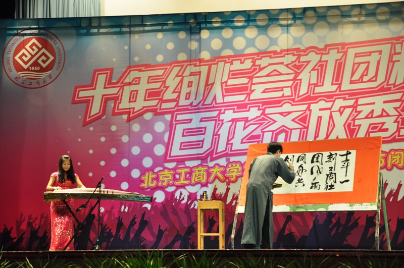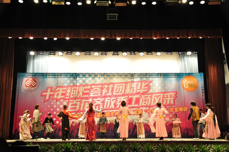 伴隨著街舞社激情飛揚的開場舞,晚會正式拉開序幕。來自我校各社團的17個節(jié)目依次出場,展示了他們的風采。激揚的青春、絢爛的夢想在此刻上演。BTBU吉他社用其充滿夢想與激情的樂隊演奏向觀眾們展示了原創(chuàng)音樂的力量;來自雪域鍋莊社的二十名藏族同學身著華麗的藏服,踏著《洗衣歌》輕松歡快的節(jié)奏,為觀眾們帶來了展現(xiàn)民族風采的鍋莊舞;武術(shù)協(xié)會則以剛?cè)岵Q道,干凈利落的武術(shù)動作,精彩的雙截棍和跆拳道表演迎得了在場師生們的陣陣掌聲;魔術(shù)社充滿神秘氣息的魔術(shù)表演更是將現(xiàn)場氣氛逐步推向高潮;書法社現(xiàn)場書寫了“十年一刻工商社團風雨同舟 共創(chuàng)輝煌”以表達對學校社團文化節(jié)的祝愿;詩朗誦《十年一刻》總結(jié)了社團文化節(jié)走過的十年歷程,同時強調(diào)了學校對社團支持、服務、管理的理念。此外,我校愛樂協(xié)會、天文社、手語社、輪滑社、B-BOX等社團的精彩表演也贏得了現(xiàn)場觀眾的陣陣歡呼與掌聲。我校團委書記呂良老師、副書記郭新愿老師還在現(xiàn)場抽取了幸運觀眾42名,并贈送了紀念品。最終,晚會在社團文體部歡快的舞蹈中完美落幕,第十屆社團文化節(jié)至此畫上圓滿句號。