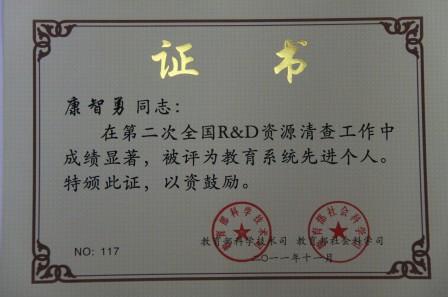 近日,第二次全國R&D資源清查領(lǐng)導(dǎo)小組辦公室下發(fā)了《關(guān)于表彰第二次全國R&D資源清查先進(jìn)集體和先進(jìn)個(gè)人的決定》(國清查辦字[2011]6號),對第二次全國R&D資源清查先進(jìn)集體和先進(jìn)個(gè)人進(jìn)行表彰。我??茖W(xué)技術(shù)處康智勇同志成績顯著,被評為第二次全國R&D資源清查教育系統(tǒng)先進(jìn)個(gè)人。