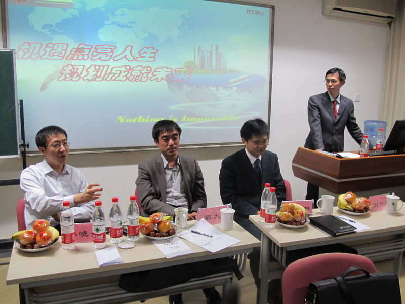 12月3日下午,經(jīng)濟(jì)學(xué)院金融系第一期“金融學(xué)專業(yè)大學(xué)生職業(yè)規(guī)劃講壇”在阜成路校區(qū)舉行。金融系邀請了中國建設(shè)銀行總行住房金融與個(gè)人信貸部高級經(jīng)濟(jì)師韓曉杰、中國工商銀行總行公司業(yè)務(wù)二部商品融資處副處長周大偉、東北證券投資銀行部北京市場部副總經(jīng)理呂燦林和學(xué)生們廣泛交流觀點(diǎn)、分享入職經(jīng)驗(yàn),部分金融畢業(yè)班學(xué)生和研究生參加了講壇,講壇由該系金融教研室副主任張偉主持。