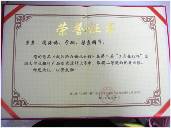12月19日,第二屆“工商銀行杯”全國(guó)大學(xué)生銀行產(chǎn)品創(chuàng)意設(shè)計(jì)大賽頒獎(jiǎng)典禮在對(duì)外經(jīng)貿(mào)大學(xué)舉行,我校經(jīng)濟(jì)學(xué)院10級(jí)研究生曹慧、聞海赫與中國(guó)人民大學(xué)的于翔和梁霞組隊(duì)參賽,團(tuán)隊(duì)設(shè)計(jì)的《我的給力婚禮計(jì)劃》獲得全國(guó)二等獎(jiǎng)的好成績(jī)。
