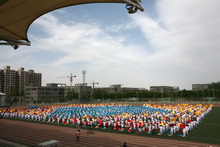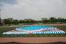 千人團體操是我校歷史上首次大型的團體操表演。開學之初,體藝部王立紅、武博等老師就投入到創編團體操的系列工作中。整個團隊大膽選材、創新設計,在有限的時間內完成了整套動作的編排。據組織者王立紅老師介紹:為給全校師生呈現一出場面宏大、精彩絕倫的表演,從3月初接到任務,4月9日完成整體構思,到第一階段訓練開展,再一步一步修正、理論設計和實際操作相結合,前后花費了一個多月的時間。創編團隊從兩百多首歌曲中,選出了《陽光體育》、《相親相愛》、《我愛你我的北京》三首作為背景音樂。它們既體現了北京精神,又展現了我校和諧的文化氛圍。訓練的過程中,同學們的集體意識逐漸增強。這是老師最愿意看到的,也是學生們最大的收獲。
