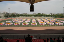 今年團體操有三個特點。一是參與人數多,往年最多只有600人,今年達到了1100人;二是運用素材多,以前只用一種道具,今年我們用了旗幟和扇子兩種道具;另外,主題選材亮,北京精神貫穿于整個節目始終,并且加入陽光體育、和諧校園等更豐富的內涵;三是部門合作好,今年,教務處、后勤處、保衛處等部門和各學院通力合作,有效的解決了千人訓練的管理和后勤問題。