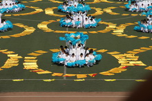 表演前,全體參演同學齊聲高喊:“加油!加油!加油!”為自己的最后一次演出鼓勁助威。烈日照耀下的紅黃彩旗和藍色扇子更加鮮艷、耀眼,每一個表演細節和每一位同學的表情都更加明顯。同學們精神飽滿,動作干凈利落,富有張力。伴隨著歌曲《我的北京我的家》激揚的旋律,藍色波浪在熾熱的陽光下層層蕩漾,紅黃旗幟飄蕩眼前。當音樂聲結束,畫面定格在用紅黃旗幟所擺成的“BTBU”,同學們兩個多月的辛苦訓練在這一刻畫上圓滿句號。