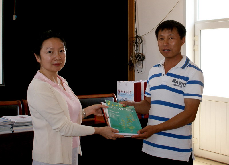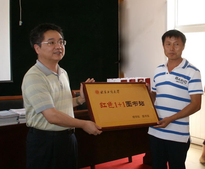 隨后進行的是紅色“1+1”圖書站啟動儀式。此前,學校圖書館、理學院多方籌集適合本次活動的書籍,共捐贈了關(guān)于新型農(nóng)村建設(shè)、財富類以及農(nóng)業(yè)專業(yè)知識類圖書200余本。馬春暉館長在講話中表示,非常高興能夠與理學院和南河村一起開展此項活動,希望借此機會能為村民提供一些技術(shù)上的指導和幫助,同時也非常愿意在今后的日子里繼續(xù)大力支持圖書站成長,提供更多更好的書籍,讓更多的農(nóng)民朋友們受益。