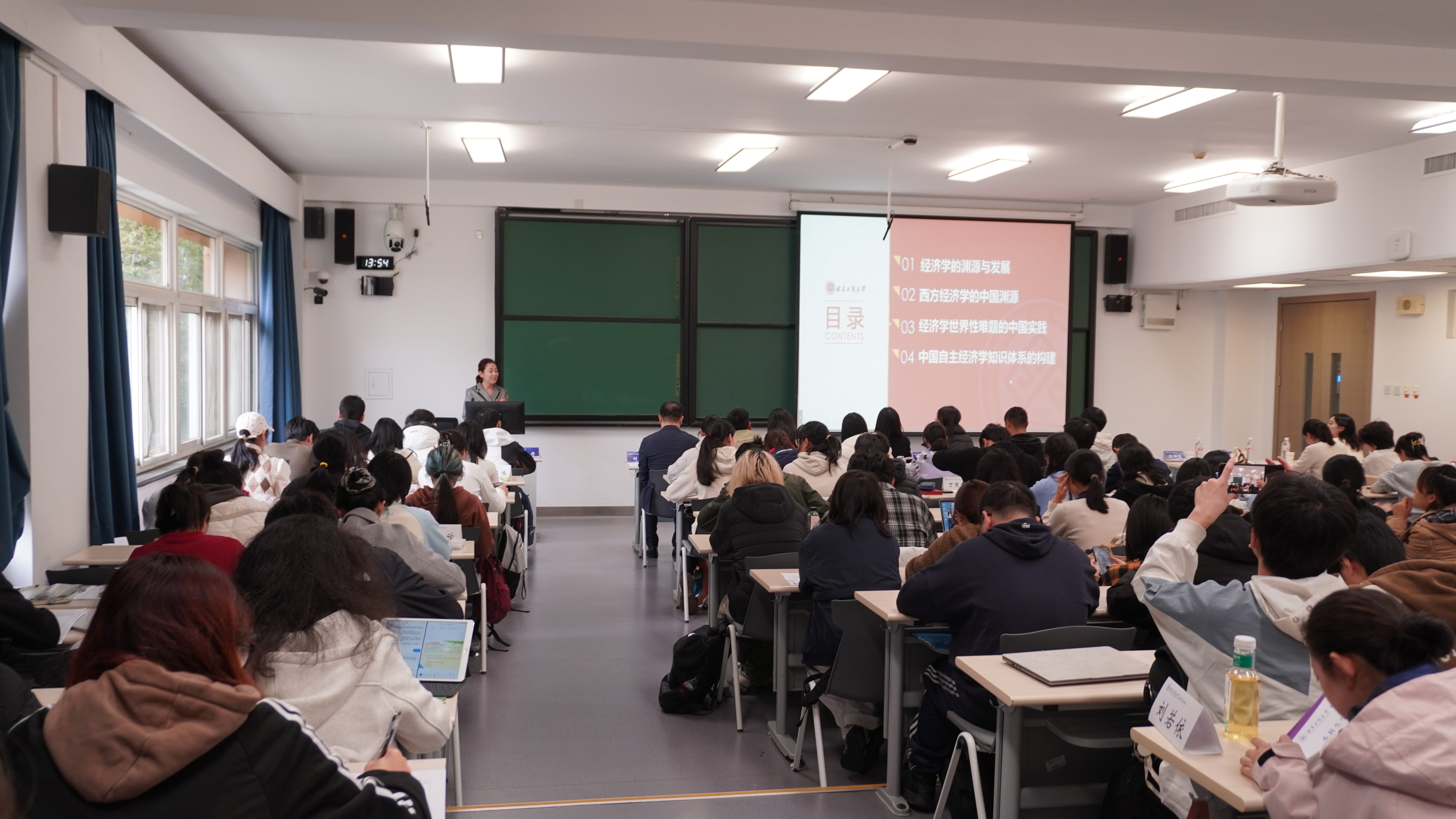 為夯實(shí)學(xué)生經(jīng)濟(jì)學(xué)理論基礎(chǔ)、增強(qiáng)對(duì)中國(guó)自主知識(shí)體系構(gòu)建的認(rèn)知,10月30日下午,黨委常委、副校長(zhǎng)、經(jīng)濟(jì)學(xué)院教授、博士生導(dǎo)師徐丹丹,為全院師生帶來(lái)專(zhuān)題講座《以史為鑒 扎根實(shí)踐 構(gòu)建中國(guó)自主經(jīng)濟(jì)學(xué)知識(shí)體系》,解碼中國(guó)經(jīng)濟(jì)實(shí)踐對(duì)經(jīng)濟(jì)學(xué)世界性難題的獨(dú)特解答,主要涵蓋“經(jīng)濟(jì)學(xué)的淵源與發(fā)展”“西方經(jīng)濟(jì)學(xué)的中國(guó)淵源”、“經(jīng)濟(jì)學(xué)世界性難題的中國(guó)實(shí)踐”以及“中國(guó)自主經(jīng)濟(jì)學(xué)知識(shí)體系的構(gòu)建”四大部分內(nèi)容。數(shù)字書(shū)院副院長(zhǎng)許曉芳等書(shū)院班子成員、輔導(dǎo)員、管理助理以及數(shù)字書(shū)院全體學(xué)生參加講座。本次講座由數(shù)字書(shū)院院長(zhǎng)助理劉歡教授主持。