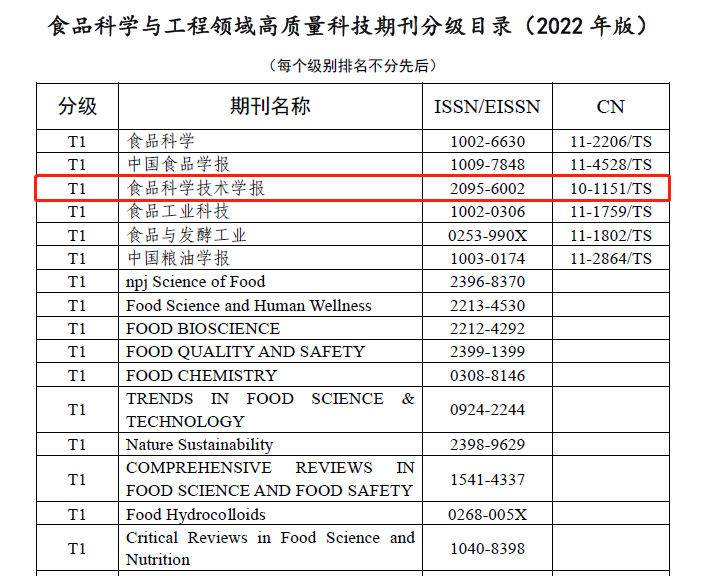 近日,由中國科協統一部署,我國首次面向全球食品科技期刊開展分級認定的《食品科學與工程領域高質量科技期刊分級目錄》(以下簡稱《分級目錄》),在中國食品科學技術學會官網正式發布,其中由我校主辦的《食品科學技術學報》入選《分級目錄》第一方陣,即T1類。