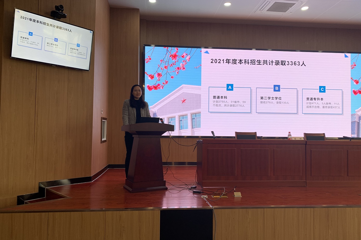 招生就業處處長楊林介紹了召開此次會議的背景和目的,并對各學院落實有關會議精神提出建議。招生就業處副處長石松從就業工作面臨形勢、2021屆畢業生就業情況、2022屆畢業生基本情況及就業進展情況、針對不同就業群體的工作思路和重點工作推進六個方面對就業工作進行部署。本科招生負責人卜曉媛從本科招生基本情況、存在問題、推進工作和工作日程四個方面對本科招生工作進行介紹。