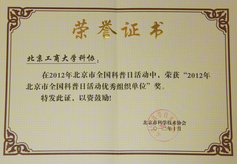11月1日,2012年北京市全國科普日活動總結表彰大會在北京科技活動中心召開。城區科協、郊區科協、企業科協、高校科協的工作人員參加了會議。我校科協獲得“2012年北京市全國科普日活動優秀組織單位”。