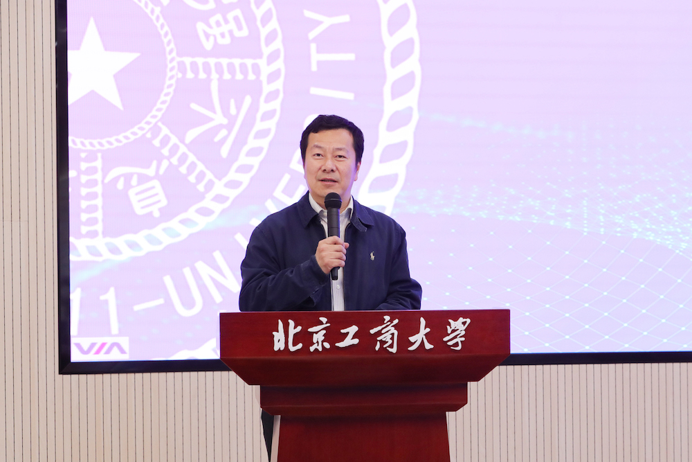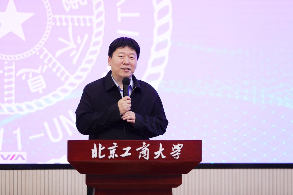 清華大學(xué)自動化系主任張濤致辭。他表示,這是他第一次走入北京工商大學(xué)良鄉(xiāng)主校區(qū),欣喜的是兩校除了教師之間的交流,也逐步開展學(xué)生層面的活動。此次隨行的清華大學(xué)學(xué)生包括了系團(tuán)委書記、學(xué)生骨干和科協(xié)會長等,希望可以深入交流,進(jìn)一步探索合作方向。他表示,清華大學(xué)自動化系和北京工商大學(xué)人工智能學(xué)院關(guān)系緊密,目前自動化專業(yè)也逐漸將傳統(tǒng)控制與人工智能相結(jié)合,守正創(chuàng)新。相信北京工商大學(xué)人工智能學(xué)院隨著系統(tǒng)科學(xué)博士點(diǎn)的建設(shè)及博士生數(shù)量的增加,會培養(yǎng)出更多優(yōu)秀人才,成長出更多杰出校友。他希望,未來雙方能夠一起努力,在科學(xué)研究、人才培養(yǎng)等方面開展更廣泛更深入的合作。