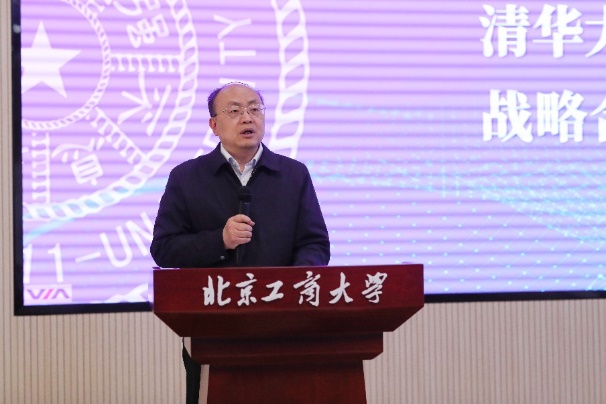 劉敏華在致辭中向與會嘉賓致以誠摯謝意,回顧了北京工商大學(xué)發(fā)展的三個(gè)階段,展示了學(xué)校第三次黨代會描繪的宏偉藍(lán)圖,闡述了未來學(xué)校的奮斗目標(biāo)。他指出,在學(xué)校“食品進(jìn)全國前三、商科數(shù)字化轉(zhuǎn)型”的發(fā)展戰(zhàn)略目標(biāo)下,人工智能學(xué)院師生一定要抓住機(jī)遇,以數(shù)字化、信息化、智能化為突破口,賦能工科與商科,推動學(xué)校“雙一流”創(chuàng)建工作,全面開創(chuàng)高水平研究型大學(xué)建設(shè)的新局面。他感謝張濤主任親自帶隊(duì)來學(xué)校進(jìn)行考察并指導(dǎo)工作,強(qiáng)調(diào)清華大學(xué)自動化系底蘊(yùn)深厚,師資力量雄厚,是我國自動化領(lǐng)域高水平人才培養(yǎng)和科技創(chuàng)新的基地和高地。自去年以來,學(xué)院已經(jīng)多次得到過指導(dǎo)和幫助,通過首屆系統(tǒng)科學(xué)博士生課程建設(shè)、邀請清華大學(xué)教師講授自動控制原理課程、邀請清華教師參加復(fù)雜系統(tǒng)建模與分析系列講座等活動,奠定了雙方合作的基礎(chǔ)。他希望,此次戰(zhàn)略合作簽約儀式可以實(shí)現(xiàn)戰(zhàn)術(shù)落地,以實(shí)干精神推動雙方務(wù)實(shí)合作,促進(jìn)人工智能學(xué)院發(fā)展,產(chǎn)出更多合作成果。