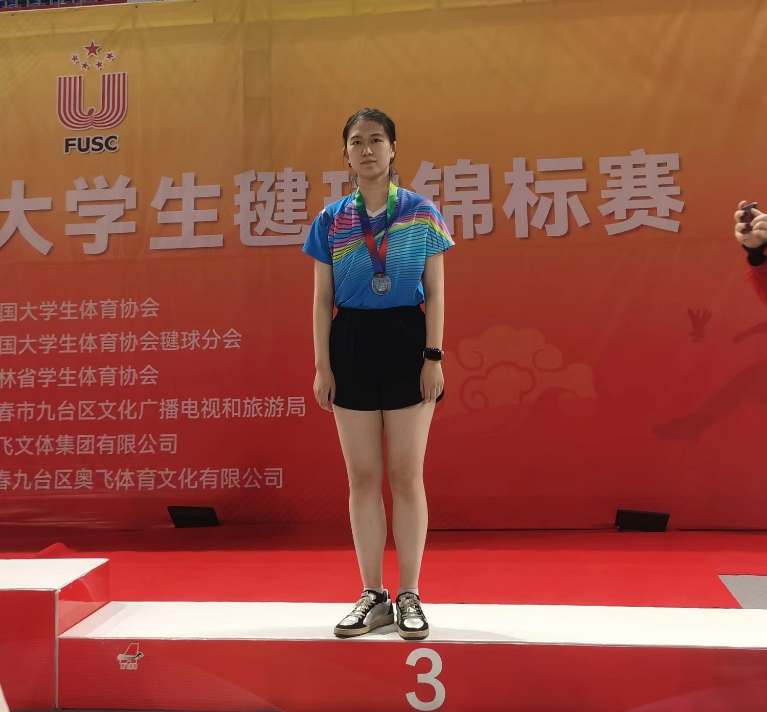 在女子單人毽球賽中,我校隊員楊天驕面對中南民族大學等傳統體育強校,發揮自身優勢特長,依靠點位移動、平快抽球頻頻得分。在女單季軍爭奪賽中,楊天驕發揮其自身實力,以大比分2:0輕松取勝,最終獲得全國第三名的佳績。