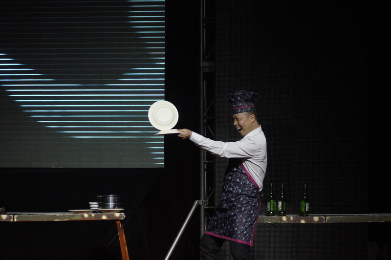 藝術(shù)源于生活,星光大道冠軍康師傅的幽默雜技表演為大家呈現(xiàn)出奇跡。一個(gè)個(gè)普通的盤(pán)子在他的手中變得不同尋常,拋出、旋轉(zhuǎn)、穩(wěn)穩(wěn)地接住,各種餐具踏著音樂(lè)動(dòng)感的節(jié)拍在他的手中轉(zhuǎn)動(dòng),引爆了現(xiàn)場(chǎng)一陣陣喝彩。