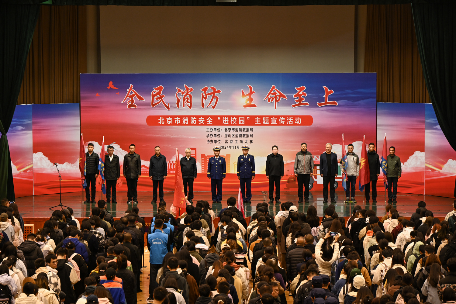 11月13日下午,北京市消防救援局在學(xué)校良鄉(xiāng)主校區(qū)文體館舉辦消防宣傳“進(jìn)校園”暨消防宣傳月系列活動(dòng)。此次活動(dòng)以“全民消防,生命至上”為主題,旨在提高師生消防安全意識(shí),增強(qiáng)校園火災(zāi)防控能力。學(xué)校黨委副書記李中奇出席活動(dòng),市消防救援局、房山區(qū)消防救援局、良鄉(xiāng)大學(xué)城管委會(huì)、北京工商大學(xué)、北京中醫(yī)藥大學(xué)、北京理工大學(xué)、首都師范大學(xué)和中國社會(huì)科學(xué)院大學(xué)、北京消防志愿服務(wù)總隊(duì)志愿者代表、房山區(qū)各消防志愿服務(wù)隊(duì)志愿者代表、高校學(xué)生代表和社會(huì)各界及群眾代表約1000人參加了活動(dòng)。
