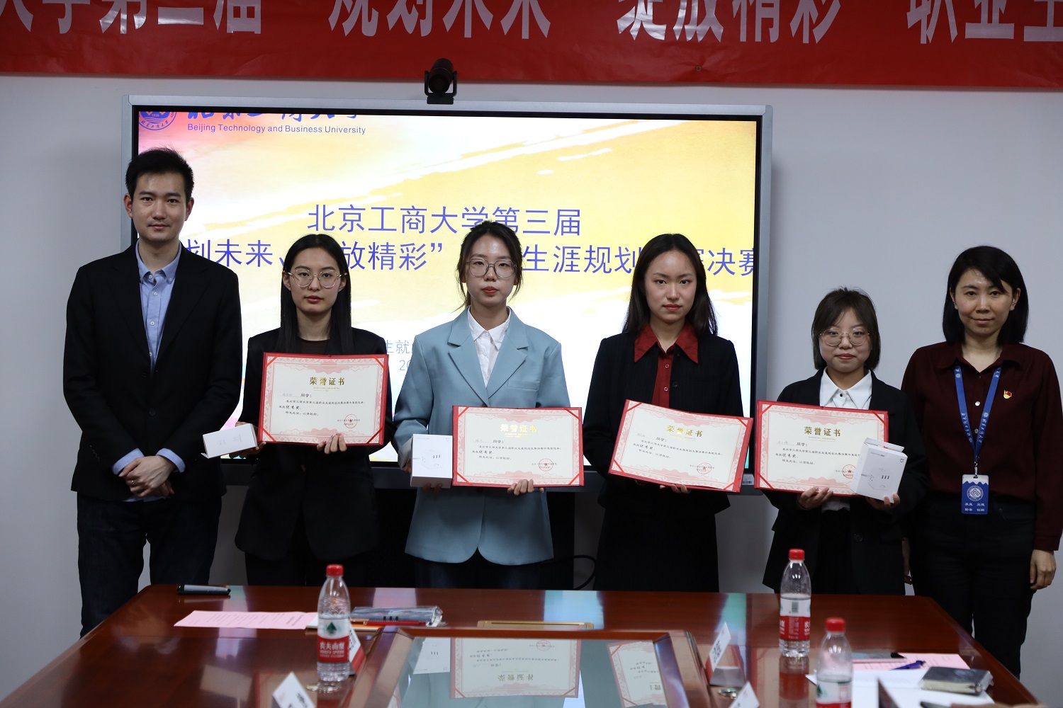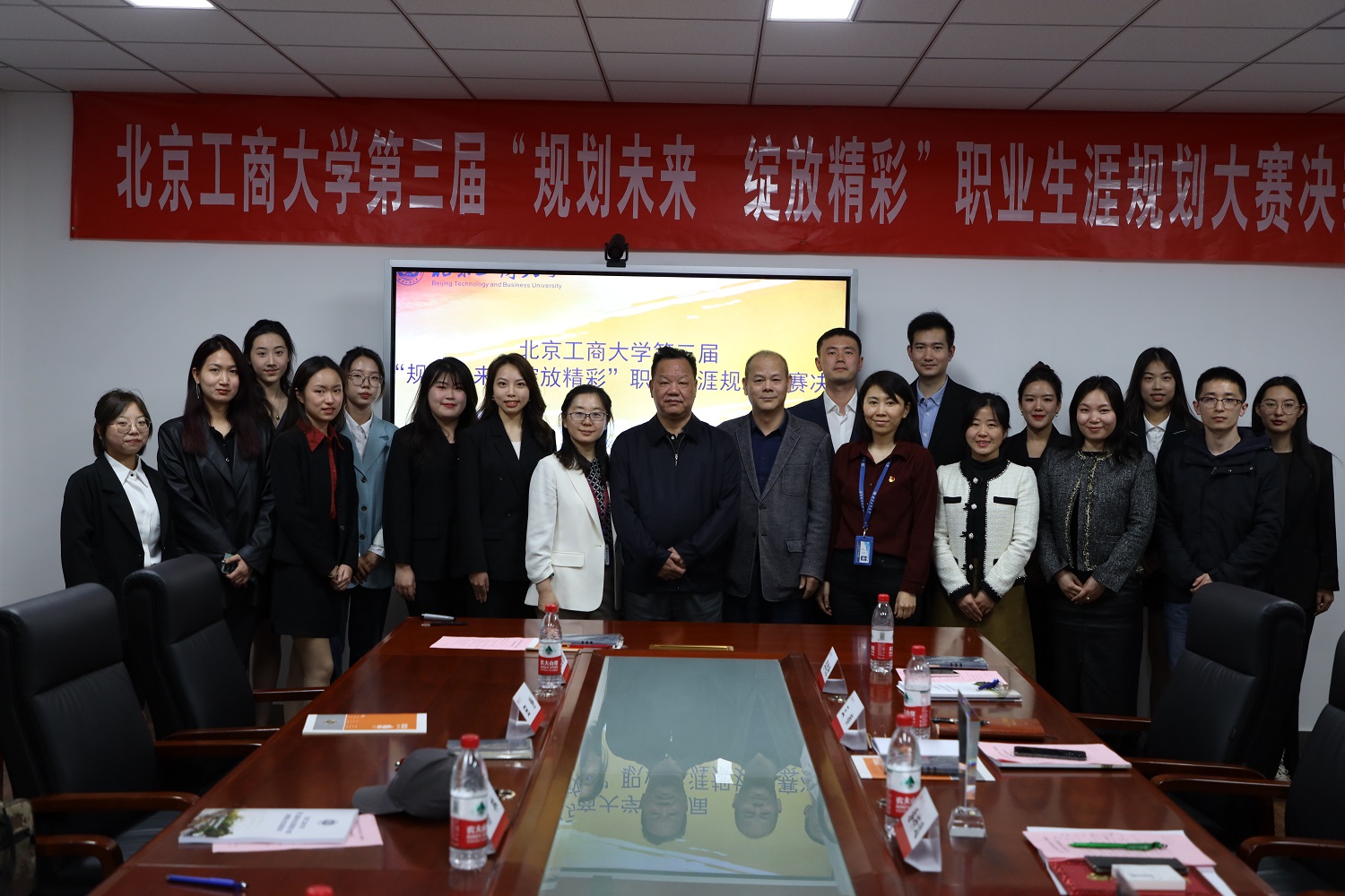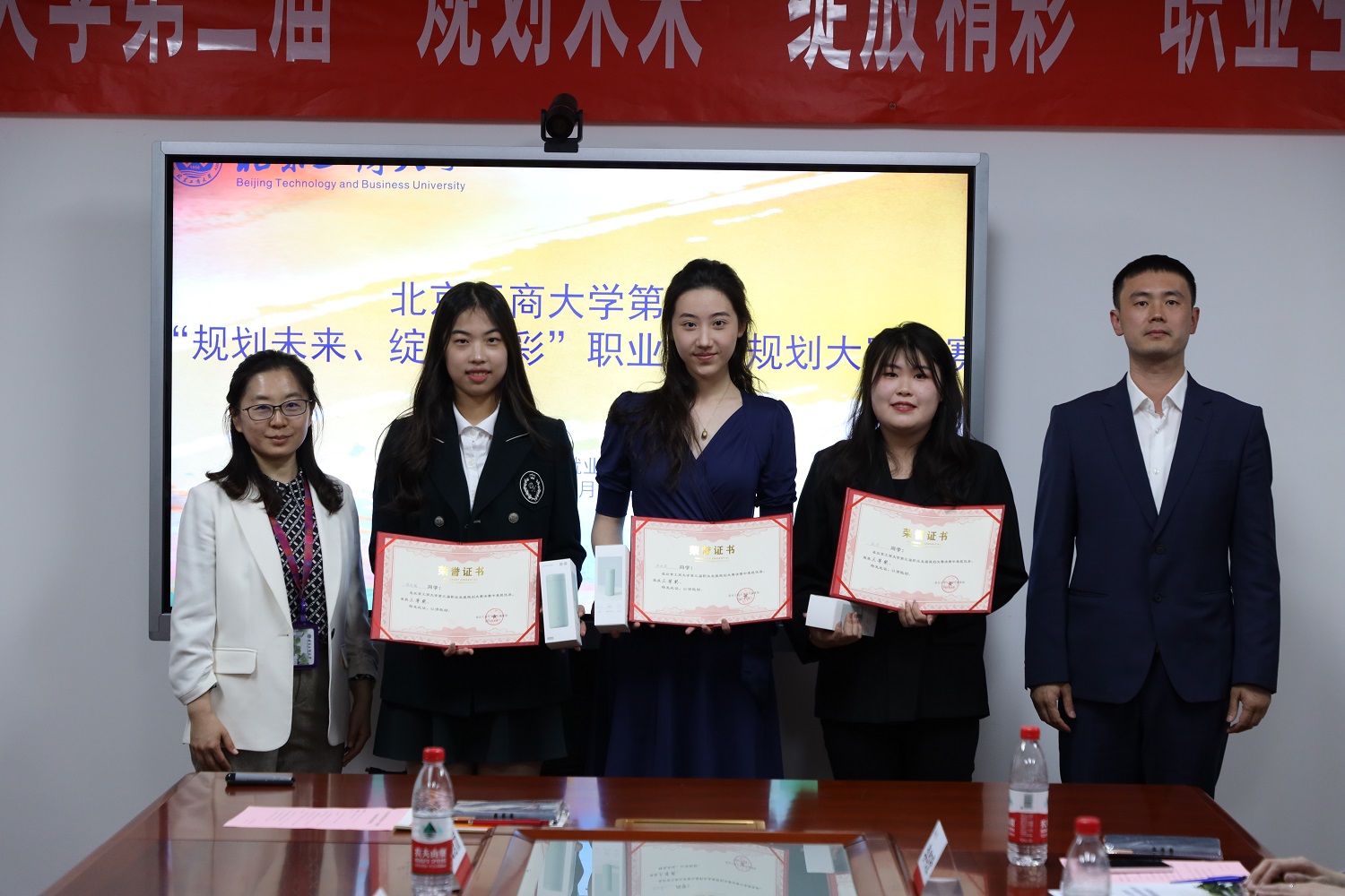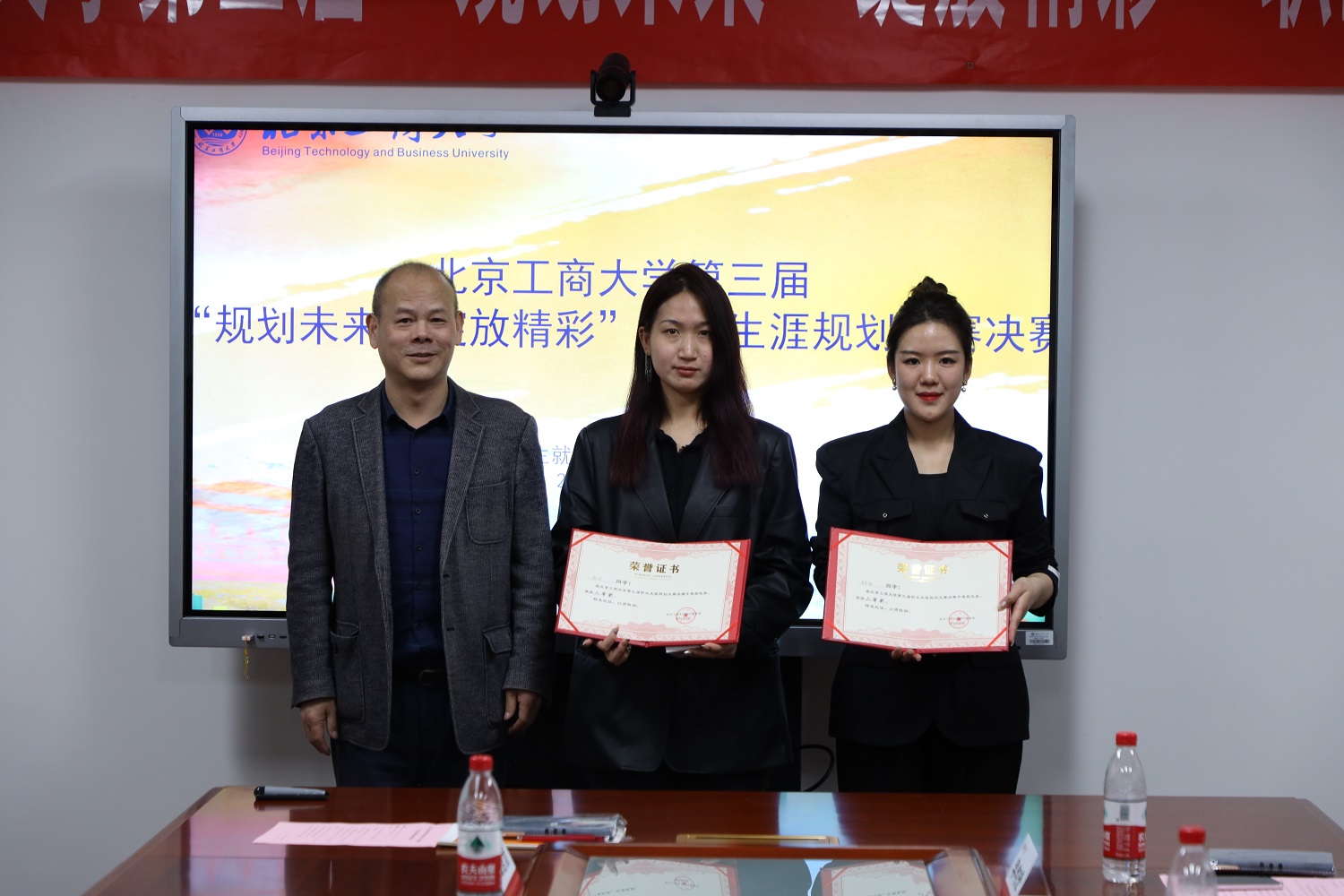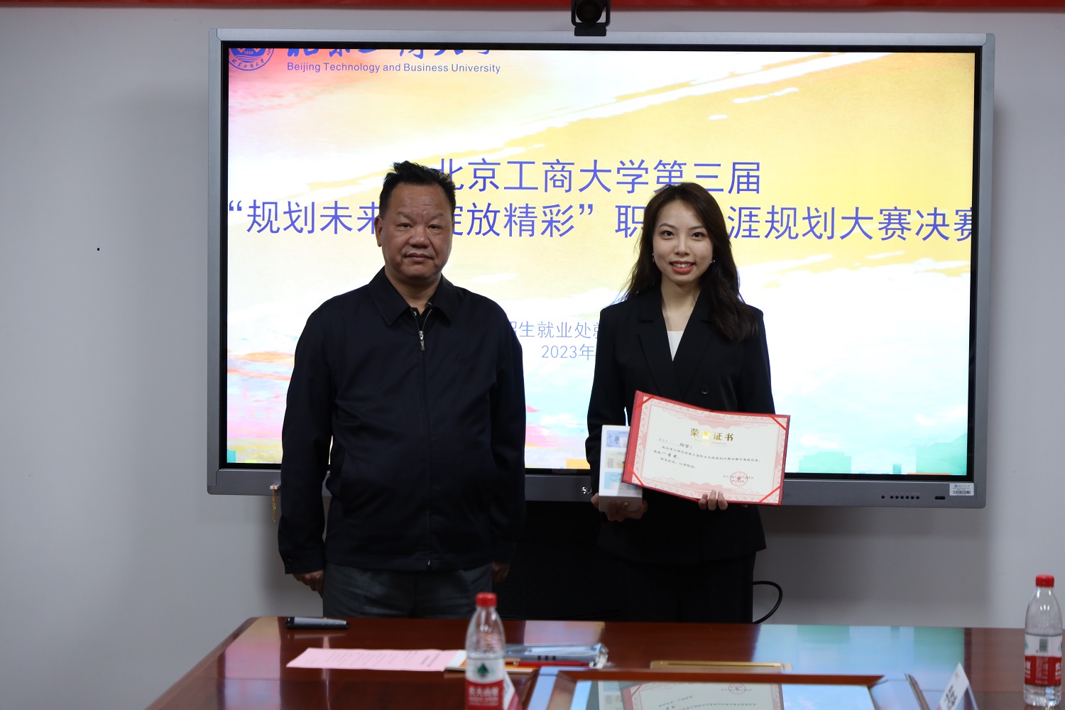 本次大賽自2020年至今已舉辦三屆,賽事緊密結合必修就業課程職業生涯規劃的教學任務開展,由各學院任課教師選拔報送優秀的職業生涯規劃書參賽,大賽共收到278份生涯規劃書,經材料審核和初賽選拔出24位選手進入復賽,經過復賽的兩場比拼遴選出10名選手進入決賽。大賽特邀教育部學生服務與素質發展中心特聘專家王潔穎、北京理工大學就業指導中心主任助理田靜、北京京房眾聯勞務派遣有限公司總經理王楠、北京工商大學研工部教師李昀澄擔任評委。十位參賽同學經過生涯陳述、回答評委提問、生涯主題卡答題等環節的激烈角逐,商學院注會214的姜俊宇同學獲得了一等獎。