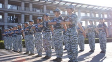 上午的訓練項目還是從站軍姿開始,看似簡單的站立動作,做起來卻沒有那么簡單。手掌緊貼褲縫線,挺胸抬頭,膝蓋繃直,身體的每一個部位都要用上勁兒,短短的二十分鐘軍姿就已經浸濕了同學們的衣衫。在接下來的齊步正步走的訓練中,教官一次次的糾正和指導,同學們的步伐明顯較前幾日規范了很多,踢腿和擺臂的高度都能一致地揮到同一水平線上,排面的對齊也有了很大的進步,平日里不茍言笑的教官在今日也露出了難得的笑容。