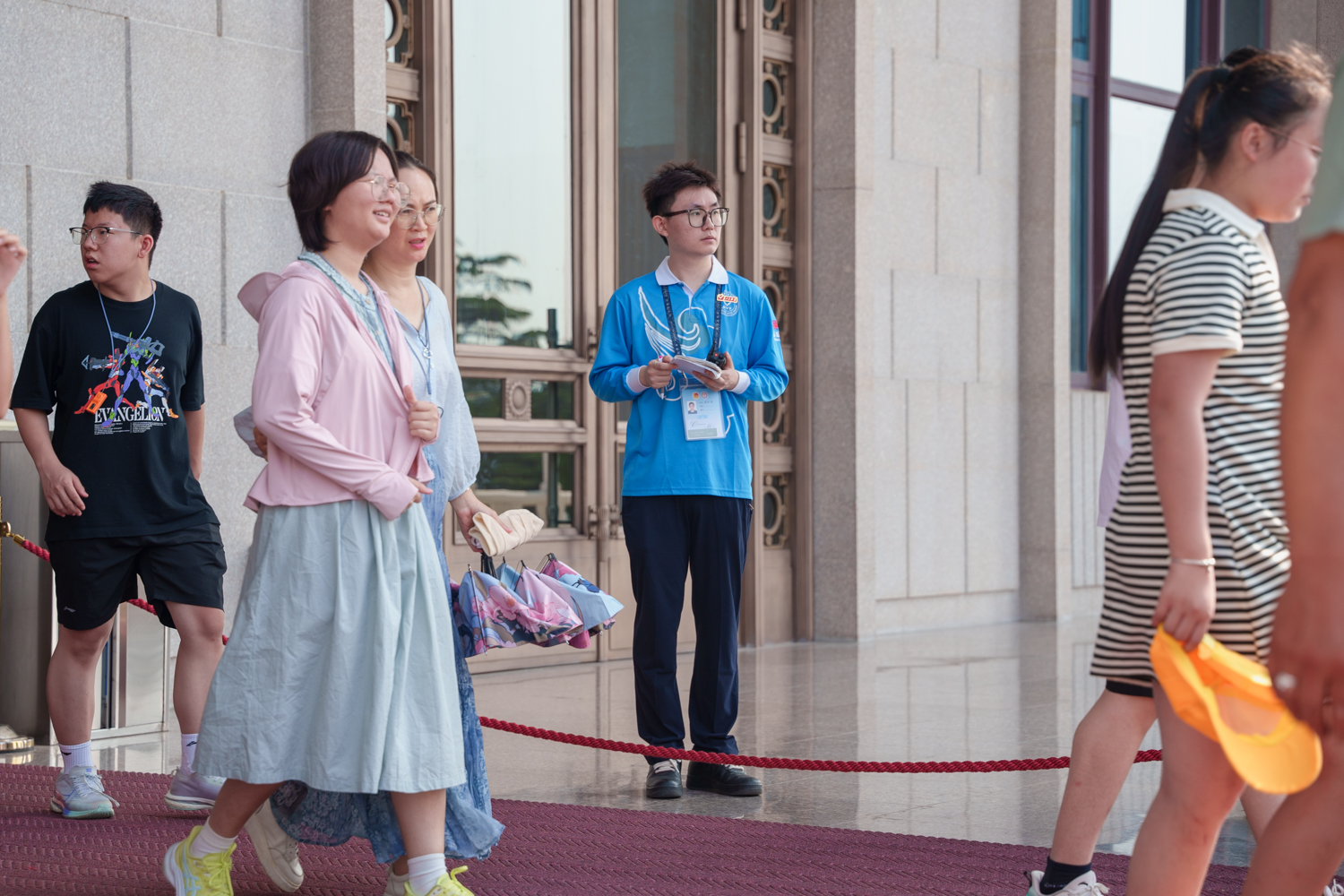 在紀念堂的北側(cè)流淌著一條由瞻仰群眾匯成的“思念的河”,他們懷著崇敬之心從各地奔赴而來。烈日酷暑下,志愿者們皮膚曬得通紅,嗓音變得沙啞,卻始終以最挺拔的身姿、最溫暖的笑容耐心解答、有序引導(dǎo)。志愿者許庭歡深有感觸地表示:“在上崗的每一天里,汗水很快便浸濕了后背,但當看到一位位瞻仰群眾懷揣著對偉大領(lǐng)袖毛主席的敬仰與緬懷之情,并順利進入紀念堂之時,瞬間便驅(qū)散了疲憊。”