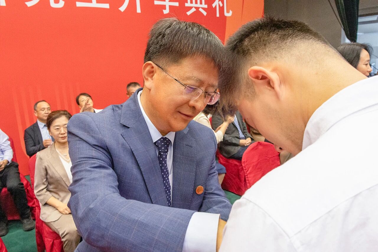 黨委書記沈千帆,黨委副書記、校長郭建華為新生代表佩戴校徽,全體新生同時起立,將校徽鄭重佩戴于胸前。學校為每位研究生新生印發校歌曲譜,“求真、立德、勤奮、創新”的校訓精神,將在2025級學子的身上得到新的傳承,煥發新的生機,匯聚新的時代力量。