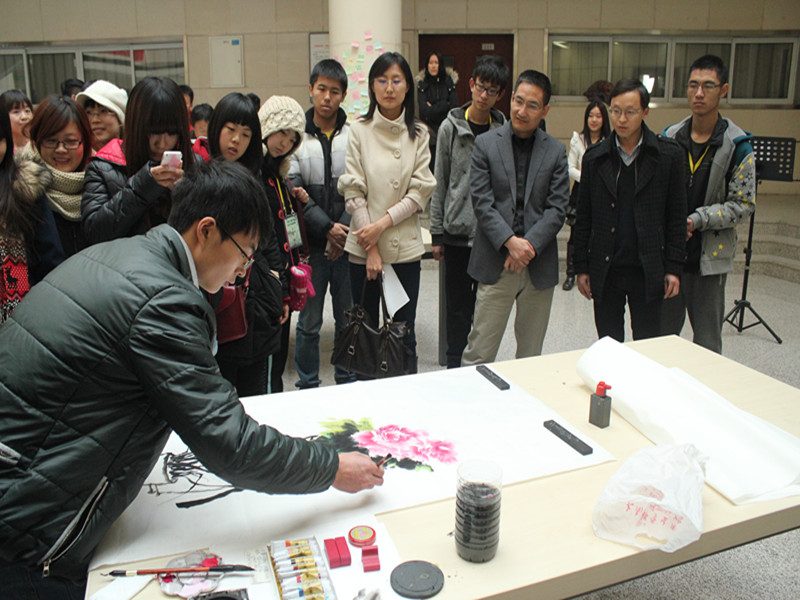 學院4名同學的現場才藝展示是開幕式的亮點。伴隨著琴笛合奏的《雨碎江南》悠揚樂聲,兩位同學現場揮毫創作出了蒼勁有力的書法作品和清新淡雅的水墨畫,令在場的師生為之嘆服。