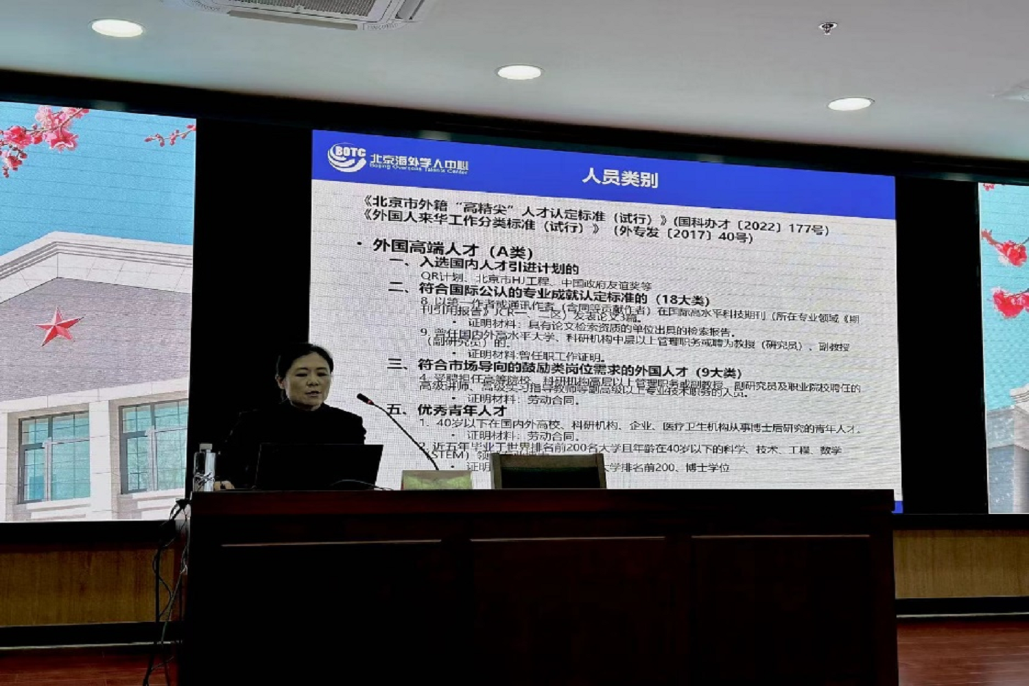 李海燕介紹了北京市科委和中關村管委會的相關工作內容,并結合我校的國際化發展情況,對高等學校學科創新引智計劃、科技部外國專家項目、中關村申請出入境和永久居住政策、海外高層次人才項目等方面的內容進行了詳細的介紹。劉魯雪結合自己多年的工作經驗圍繞外國人來華工作許可的辦理流程、外籍人才分類、外國人才簽證制度實施辦法、外國人來華材料準備的便利措施等政策進行了解讀。
