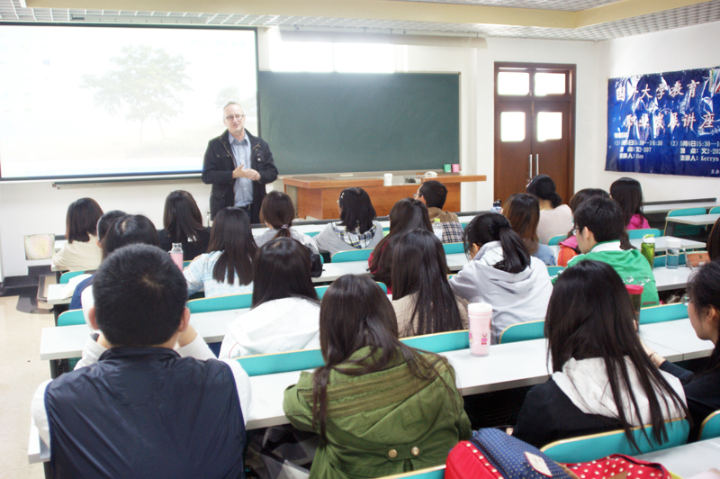 Alex Thrower曾在英國中學擔任校長,具有豐富的教學經驗。他從中外大學教育的異同入手,向同學們系統地介紹英國大學的培養模式和教育發展趨勢,解答大家關于出國留學、就業等方面的問題。他講,作為一名大學生,應學會獨立思考,并對個人學業和職業發展進行規劃,確定適合自己的發展方向。他特別指出,在全球化人才發展的背景下,世界各國大學生都將面臨更加嚴峻的就業壓力,并希望同學們能夠樹立正確的擇的意識和就業觀念。