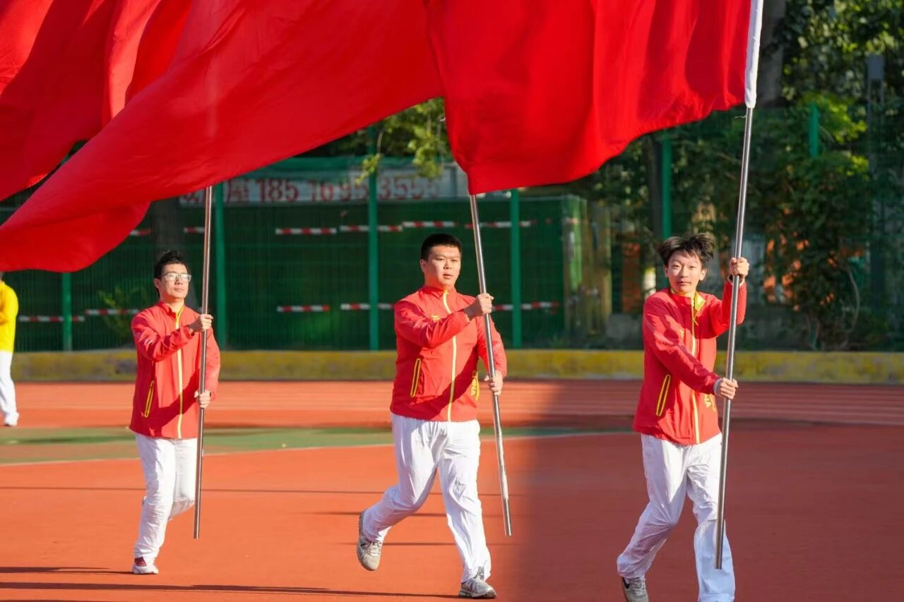 五星紅旗冉冉升起,全場師生共同唱響國歌。