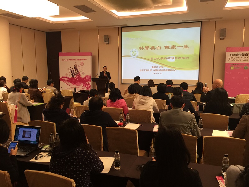 PCHi是國內化妝品原料領域首屈一指的展會,我校理學院四位專家教授受邀參與,同時,我校中國化妝品研究中心與中國化妝品協同創新中心、北京日化協會與國藥勵展展覽有限責任公司共同舉辦了“2015天然植物美白專題亞洲學術論壇“2015天然有機化妝品發展趨勢論壇,擴大了我校在化妝品領域的影響和作用。