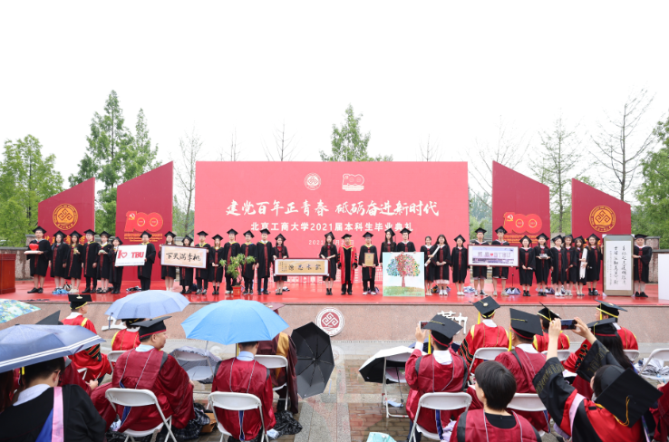 13個學院的畢業生代表為母校送上了極具創意、寓意深刻的禮物,表達了對母校、老師、同學的美好祝福。數學與統計學院畢業生制作的笛卡爾心形模型,將心型方程拓撲在三維空間,表達了對母校的愛與感激;食品與健康學院畢業生親手制作了營養豐富的泡騰片,以所學回報母校;輕工科學技術學院畢業生們送出親手織就的I LOVE BTBU,表達了對母校難以割舍的情愫;化學與材料工程學院畢業生為母校獻上了字畫牌匾,祝母校蓬勃發展、再書華章;生態環境學院畢業生送出一棵桃樹,寓意年年桃李,歲歲芬芳;人工智能學院畢業生送上名為“飲水思源”的書法作品,感謝學校的栽培;計算機學院畢業生送出自主設計開發的互動平臺“我記得你”,緬懷先烈,不忘初心,迎接建黨百年;經濟學院畢業生送出創意拼貼畫,感謝學校為他們系好人生第一顆紐扣;商學院畢業生送出“經略方物創勤勉之學,工商少年撰立德之章”的對聯,表達出對母校的愛意與對未來的期許;電商與物流學院畢業生送出由百余名學子簽名組成的匾額,一筆一劃表達著對學校的感恩和祝福;法學院畢業生送上刻有學校校徽與校訓的“民法典”水晶書,寓意將秉持校訓,砥礪前行;外國語學院畢業生送上英譯校歌,祝愿學校輝煌無限更向前;傳媒與設計學院畢業生送出“青衿之志履踐致遠,云程發軔萬里可期”的對聯,表達將與學校共同奔赴向前。黨委書記黃先開代表學校接受了禮物,并與同學們合影留念。