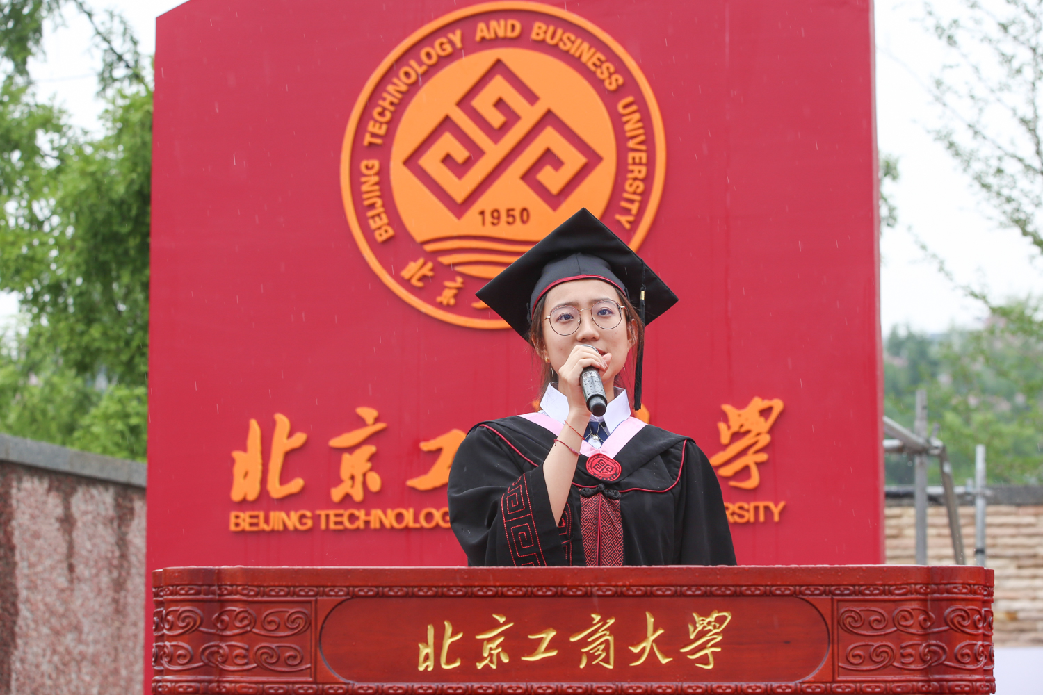 傳媒與設計學院李昕澍代表畢業生發言。她談到,四年來在北工商收獲了知識與成長,見證了母校的蒸蒸日上,度過了美好的青春,分別之際,由衷地感謝母校和老師們的辛勤培育,感謝互學互助的摯友,感謝無私奉獻的家人和從未放棄的自己。她勉勵畢業生們:少年心事當拿云!未來的路途依然遙遠而顛簸,愿博學且無畏,把在北工商所孕育的凌云壯志轉化成真真切切的行動,乘風破浪,一往無前。