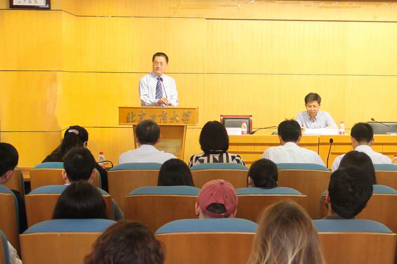 商學院副院長楊浩雄作為學院代表發言,表示真誠希望留學生盡快融入在京生活,學有所成,生活快樂。學生處副處長呂良作為職能部門代表發言,他從學生管理、學校生活、提高自身綜合素質等三方面對留學生提出了建議和希望。商學院講師田翛然作為留學生任課教師代表發言,她鼓勵留學生走出校園,結識中國朋友,了解中國文化。同時,她也提醒留學生們要和自己的家人保持聯絡,認真學習。就讀于我校商學院MBA專業的俄羅斯籍留學生杰尼斯(Denis)作為新生代表發言,他表示非常高興能來到北京工商大學求學,并很榮幸地獲得了北京市外國留學生獎學金,希望自己能夠盡快地融入到學校的學習和生活,并與我校師生建立起深厚的友誼。
