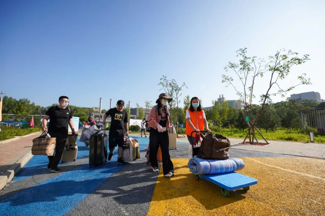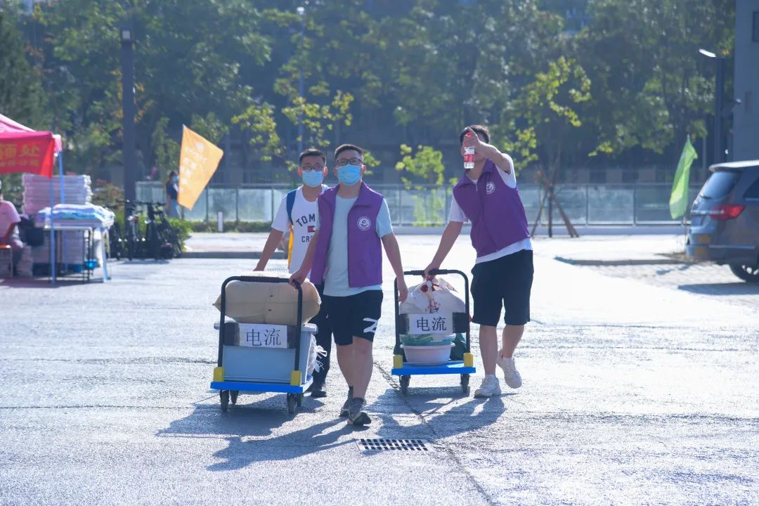 學(xué)校對(duì)每位入校的新生進(jìn)行嚴(yán)格把關(guān),校門外,安保人員細(xì)致核驗(yàn)新生身份與健康信息,并進(jìn)行測(cè)溫。根據(jù)疫情防控要求,家長(zhǎng)不能入校陪同,志愿者們排成一行隨時(shí)待命,幫助新生搬運(yùn)行李,引導(dǎo)護(hù)送新同學(xué)順利前往迎新點(diǎn),搭建起一條暢通無阻的行李“傳送帶”。