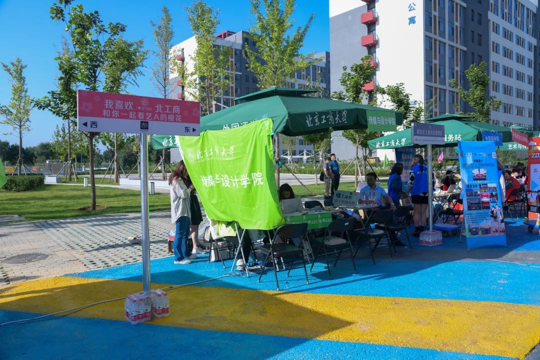 傳媒與設(shè)計(jì)學(xué)院發(fā)揮專業(yè)優(yōu)勢(shì),設(shè)計(jì)了各色迎新活動(dòng)的互動(dòng)道具,為新生準(zhǔn)備了趣味手拿牌,以及印有“我喜歡北工商傳設(shè)”的特色路牌,供新生們合影留念,記錄下初入校園的青澀面龐。