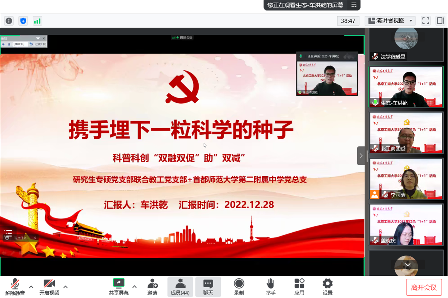 今年的紅色“1+1”活動以“請黨放心 強國有我”為主題,緊密圍繞學習宣傳貫徹黨的二十大精神這一中心內容展開。我校共有15個黨支部完成共建任務,經申報,12個支部進入最終的評審環節。評審會上,各學生黨支部通過5分鐘展示再現了本支部與共建單位開展的各項活動。